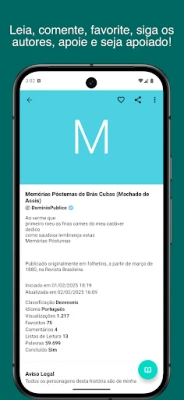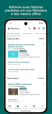 Desfrute da leitura como nunca antes com funcionalidades pensadas para o seu conforto. Organize suas descobertas favoritas em sua Biblioteca pessoal e em Listas de Leitura customizadas, garantindo acesso fácil a qualquer momento. Para uma experiência visual perfeita, personalize a interface com diferentes fontes e esquemas de cores. A liberdade de ler offline, seguir seus autores prediletos e receber notificações sobre novos capítulos, tudo isso em português, inglês ou espanhol, coloca o poder da história em suas mãos.